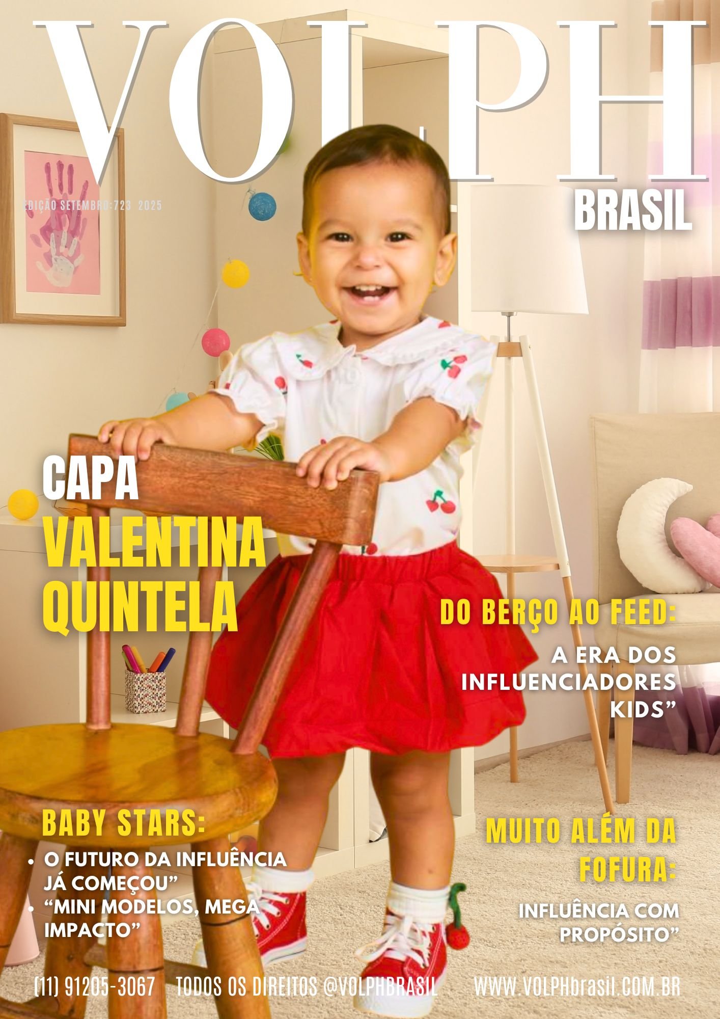 Esta matéria pode ocupar uma dupla página especial da VolphMagazine, com fotos exclusivas da pequena influenciadora, destacando não só sua fofura, mas também sua presença digital marcante.